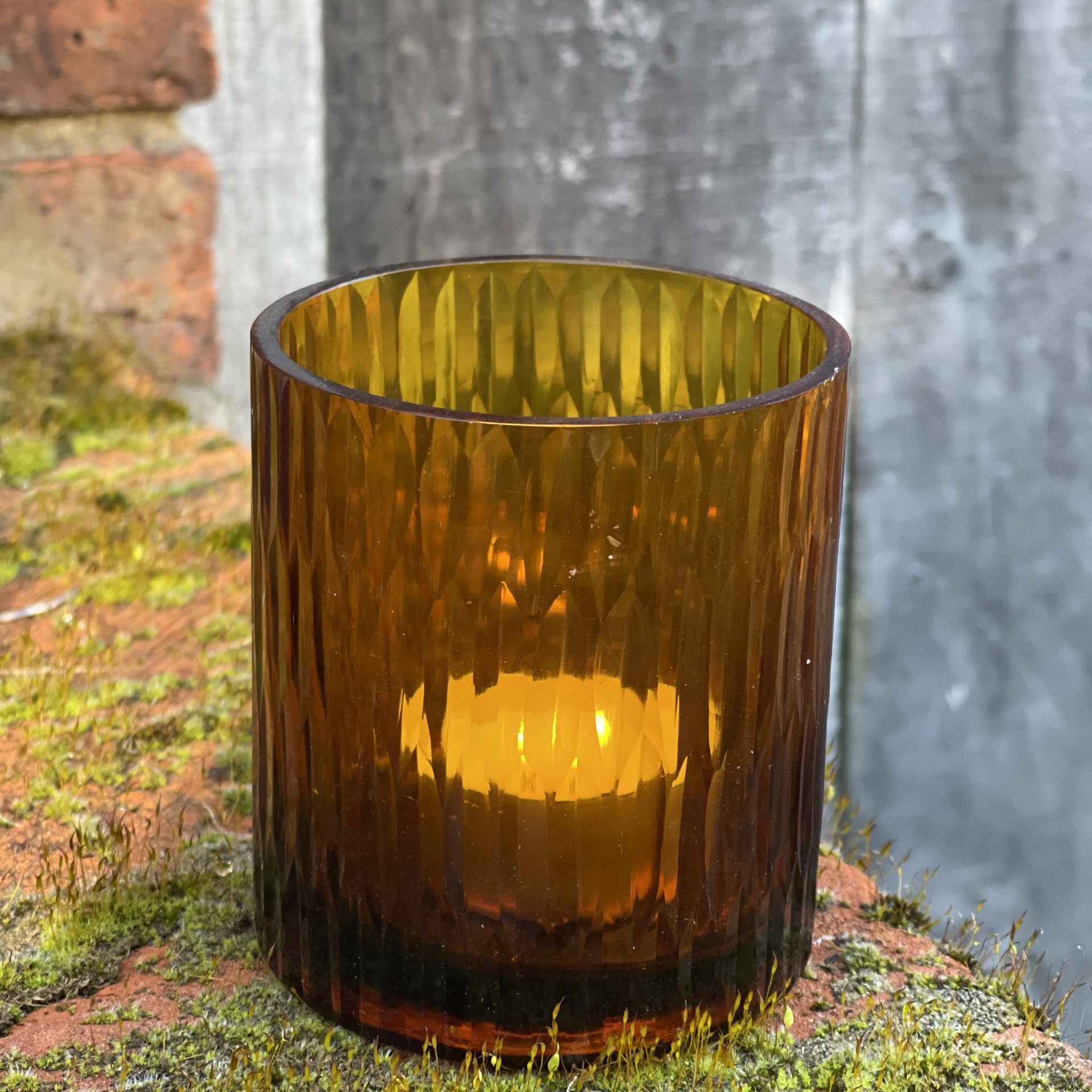 Recycled glass Amber tea light holder.