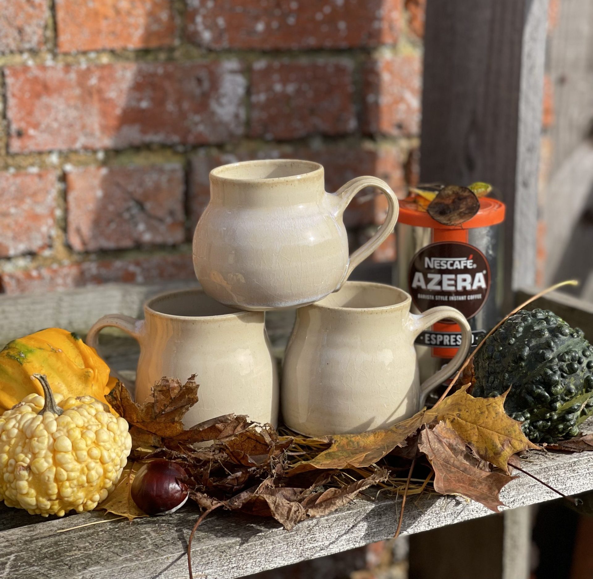 Neutral beige ceramic mug hand thrown in the Cotswolds. Each of these mugs are individual, they were commissioned by us so you won’t find this style anywhere else. They feel great to hold and give a generous helping of your favourite hot drink. Dishwasher proof too!